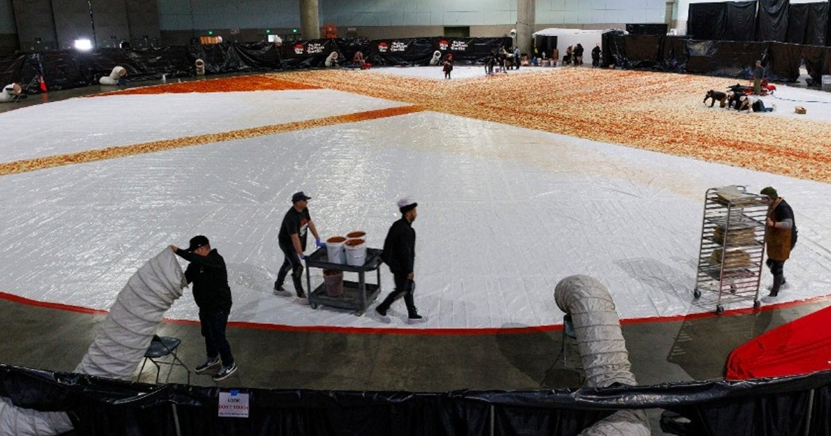 “Es un gran equipo, como pueden ver. Mira, quiero decir, mira el tamaño. Es una pizza gigante. Tiene aproximadamente mil 310 metros cuadrados. Entonces, si piensas en eso, serán como 68,000 rebanadas de pizza cuando hayamos terminado”, presumió Graves, presidente de Pizza Hut