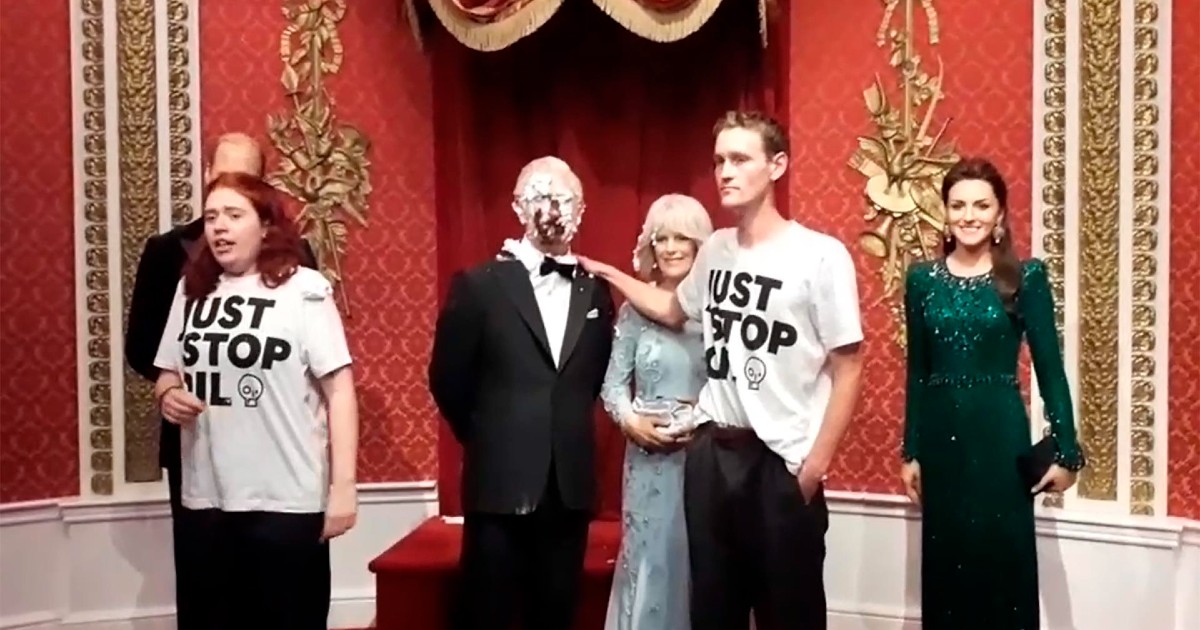 “La ciencia es clara, la demanda es sencilla: detened las nuevas licencias de petróleo y gas”, proclamaron mientras arrojaban las tartas a la escultura, que está rodeada de otros miembros de la familia real británica.