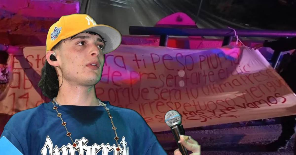 “Esto va para ti, Peso Pluma. Abstente de presentarte el día 14 octubre porque será tu última presentación por irrespetuoso y lengua suelta, te presentas y te vamos a partir tu madr*”, se lee en la manta firmada con las siglas CJNG, en referencia a la organización liderada por Nemesio Oseguera Cervantes, alias “El Mencho”.