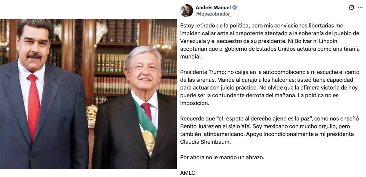 A través de su cuenta en la red social X, López Obrador calificó la intervención y detención de Maduro como un “prepotente atentado a la soberanía del pueblo de Venezuela” y llegó incluso a describirla como un “secuestro”, subrayando que ni figuras históricas como Simón Bolívar ni Abraham Lincoln aceptarían que Estados Unidos actuará como una “tiranía mundial”.