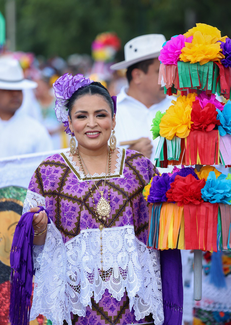 Ataviada con el tradicional terno y acompañada por mujeres igualmente vestidas con ropa típica, así como por hombres en guayabera y pantalón blanco, la presidenta municipal subrayó la importancia de preservar estas manifestaciones culturales entre las nuevas generaciones para fortalecer los valores comunitarios.