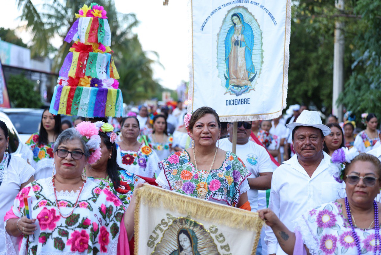Puerto Morelos.— Con una amplia participación ciudadana, el gremio de trabajadores del Ayuntamiento de Puerto Morelos llevó a cabo su tradicional procesión hacia la iglesia de La Guadalupana, seguida de una misa y una vaquería en el parque de la colonia Zetina Gasca. Las actividades estuvieron encabezadas por la presidenta municipal Blanca Merari Tziu Muñoz, en el marco del inicio de las fiestas patronales del municipio.