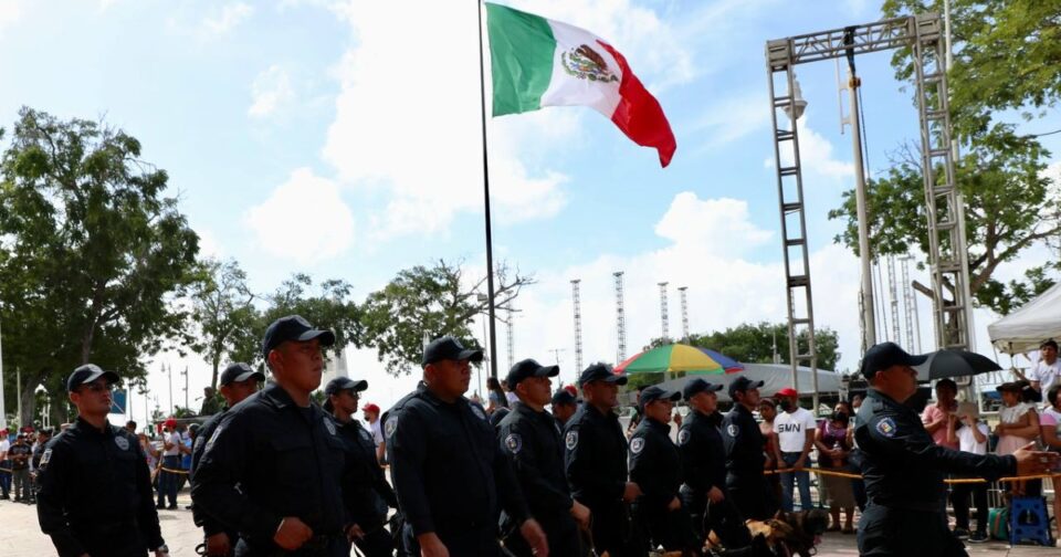 El desfile inició con la descubierta encabezada por los motopatrulleros de la Dirección Estatal de Tránsito, la banda de guerra “Titanes de Chetumal” y las escoltas de bandera de la Secretaría de Seguridad Pública.