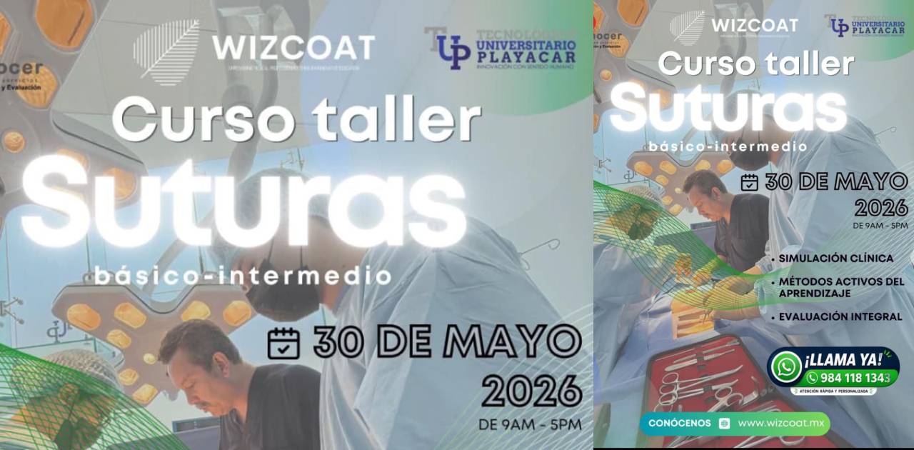 El primero de ellos, el curso-Taller de Suturas (nivel básico-intermedio), se llevará a cabo el próximo 30 de mayo en el Tecnológico de Playacar, donde los participantes podrán desarrollar habilidades en técnicas de sutura, manejo de instrumental y resolución de casos clínicos.