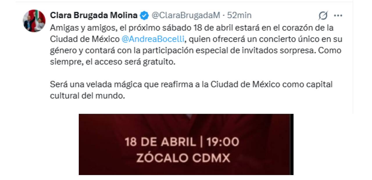 Ciudad de México.- El conocido tenor italiano Andrea Bocelli ofrecerá un concierto gratuito el próximo 19 de abril en el Zócalo de la Ciudad de México, uno de los espacios públicos más emblemáticos del país.
