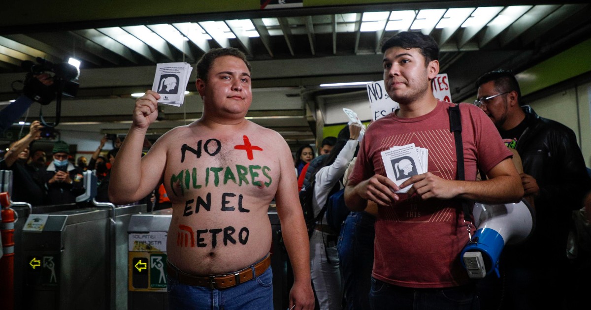 Ciudad de México.- Activistas protestaron este miércoles en la estación de metro Centro Médico de la Ciudad de México para insistir en que se retire a los 6,000 elementos de la Guardia Nacional, a cargo del Ejército, que desde la semana pasada cumplen con labores de seguridad en las estaciones.