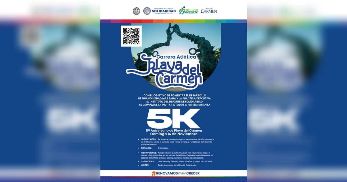 Playa del Carmen.- A fin de ofrecer actividades en el marco de los festejos por el 119 aniversario de Playa del Carmen, el gobierno de Solidaridad, encabezado por la presidenta Lili Campos Miranda, de la mano de las familias que fundaron esta ciudad, abren la convocatoria para la carrera atlética de 5 kilómetros en las modalidades libre, infantil y juvenil.