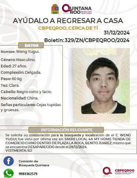 Cancún.- Autoridades de Quintana Roo emitieron una alerta para localizar a Weng Yugui, desaparece un joven empresario chino de 27 años en Cancún el pasado 29 de diciembre.