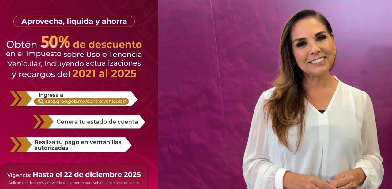 Cancún.- La gobernadora Mara Lezama Espinoza reiteró que en Quintana Roo se mantiene el subsidio total en el pago de tenencia vehicular, siempre y cuando los propietarios de vehículos se encuentren al corriente en sus obligaciones, particularmente en el pago del refrendo que incluye la tarjeta circulación.
