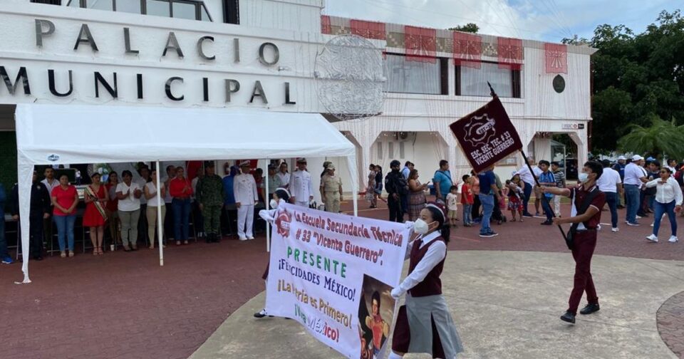Teniendo como sede final, la Plaza Cívica 28 de Julio, en la Col. Centro, varios grupos de diferentes escuelas primarias y preparatorias desfilaron desde la colonia Gonzalo Guerrero, hasta el conocido “Antiguo Palacio”.