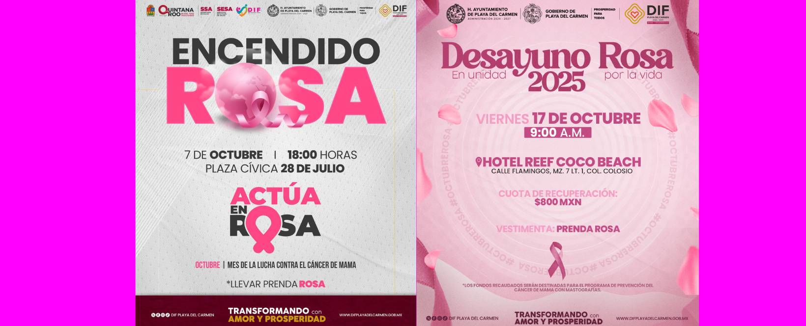 Playa del Carmen.- En el marco del Mes Rosa, el sistema DIF Playa del Carmen y el Gobierno Municipal, encabezado por la presidenta Estefanía Mercado, lanzaron una campaña integral para la prevención y detección oportuna del cáncer de mama, una de las principales causas de muerte entre mujeres en México.