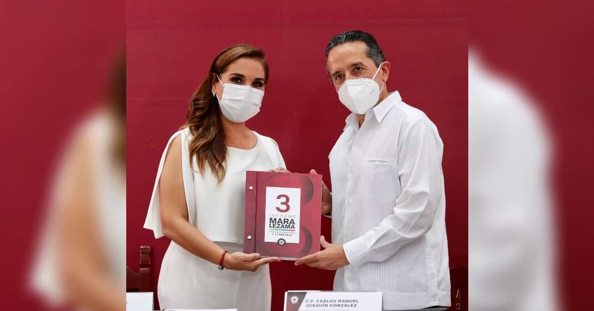 En el marco de la Novena Sesión Solemne de Cabildo, en la Sala “20 de Abril” de recinto de gobierno, la Presidenta Municipal entregó un ejemplar de la glosa del estado que guarda la administración pública 2018-2021 al gobernador Carlos Joaquín González; al magistrado presidente del Tribunal Superior de Justicia y del Consejo de la Judicatura, José Antonio León Ruiz, así como a la diputada de la XVI Legislatura del Congreso de Quintana Roo, Paula Pech Vázquez.