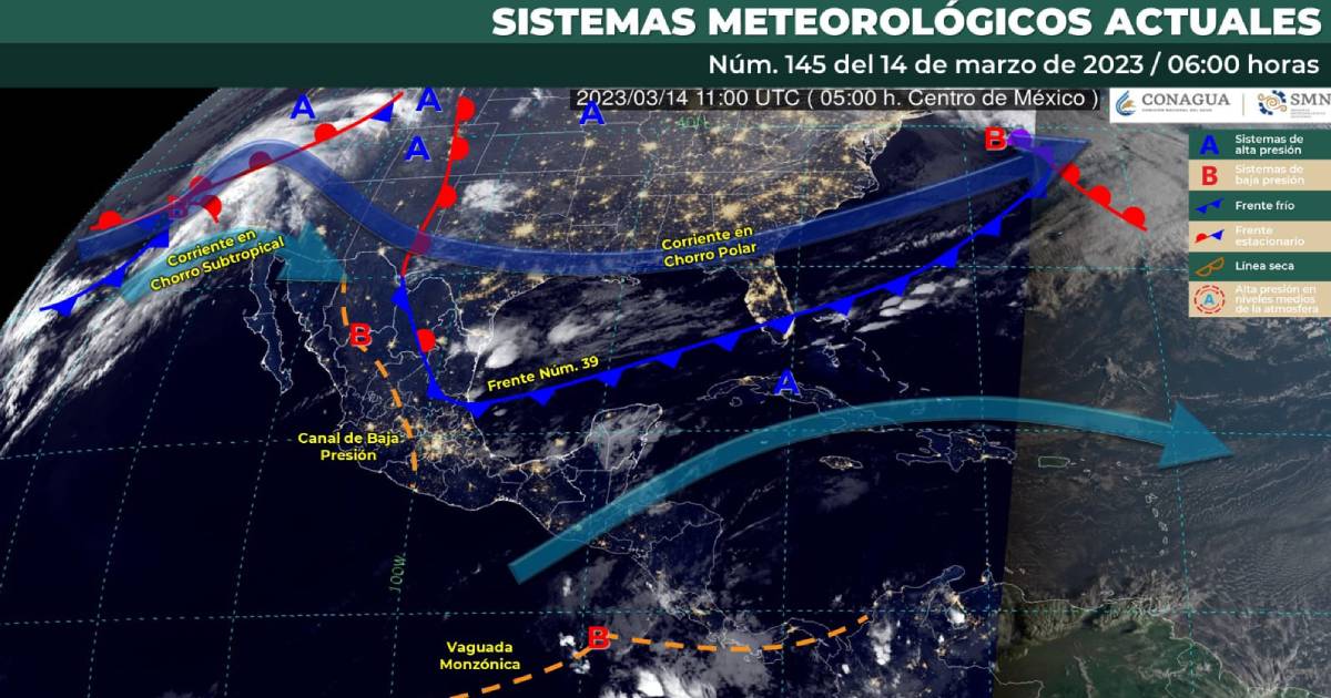Cancún.- El pronóstico para este martes incluye fuertes precipitaciones en el oriente y sureste del país debido a la presencia del frente frío número 39, que presenta características de estacionario sobre el Golfo de México, y a su interacción con un canal de baja presión.