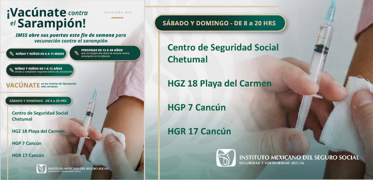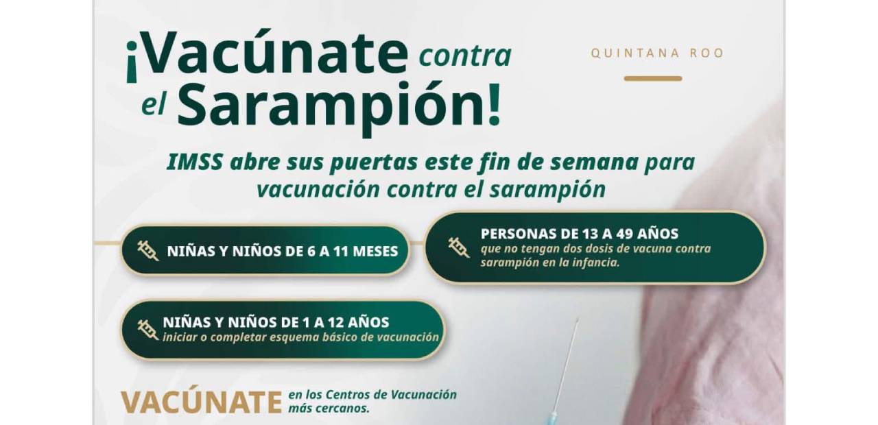 Playa del Carmen, Quintana Roo.- El Instituto Mexicano del Seguro Social (IMSS) anunció una jornada especial de vacunación contra el sarampión en el estado de Quintana Roo, con el objetivo de reforzar la protección en menores y adultos que no cuenten con su esquema completo.