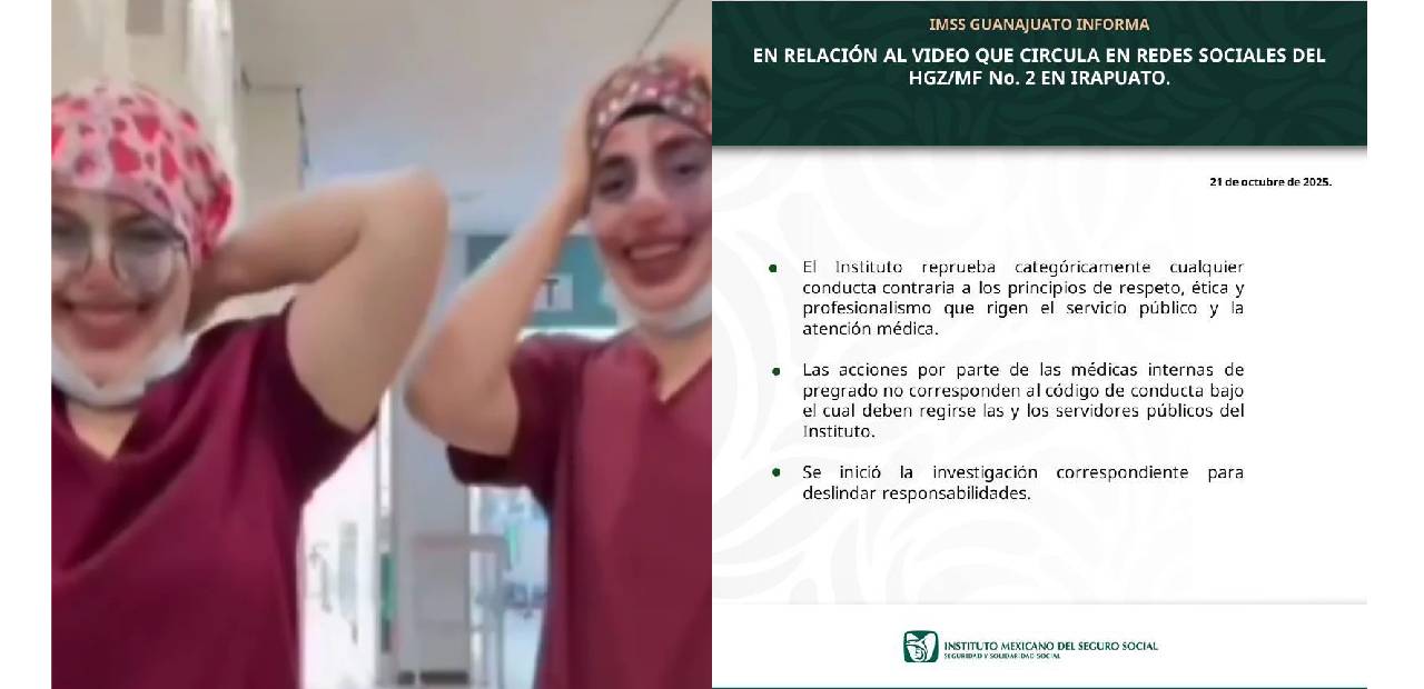 Irapuato.- El Instituto Mexicano del Seguro Social (IMSS) está investigando a dos doctoras internas de pregrado que fueron grabadas burlándose de un paciente durante su jornada laboral en un hospital en Irapuato.