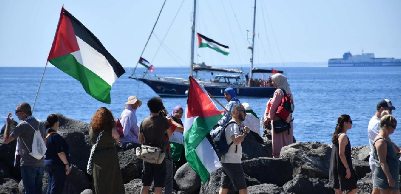 Los participantes en esta iniciativa, compuesta por más de 40 barcos y más de 500 voluntarios, se preparan para una posible intervención israelí al haber superado la zona de exclusión marcada por Israel en 120 millas náuticas (unos 220 kilómetros) en aguas internacionales.