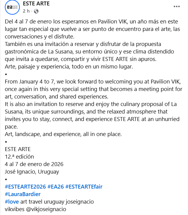 La fundadora y directora, Laura Bardier, expresó: “Con ESTE ARTE 2026 queremos expandir los límites del recinto ferial: que las obras dialoguen con los jardines, la playa y la luz costera, y que cada espacio sea territorio. Esta edición encarna nuestro deseo de que el arte no solo se muestre, sino que ocurra, que se deslice y se transforme con los visitantes. Aquí, menos no es poca cosa: es posibilidad”.