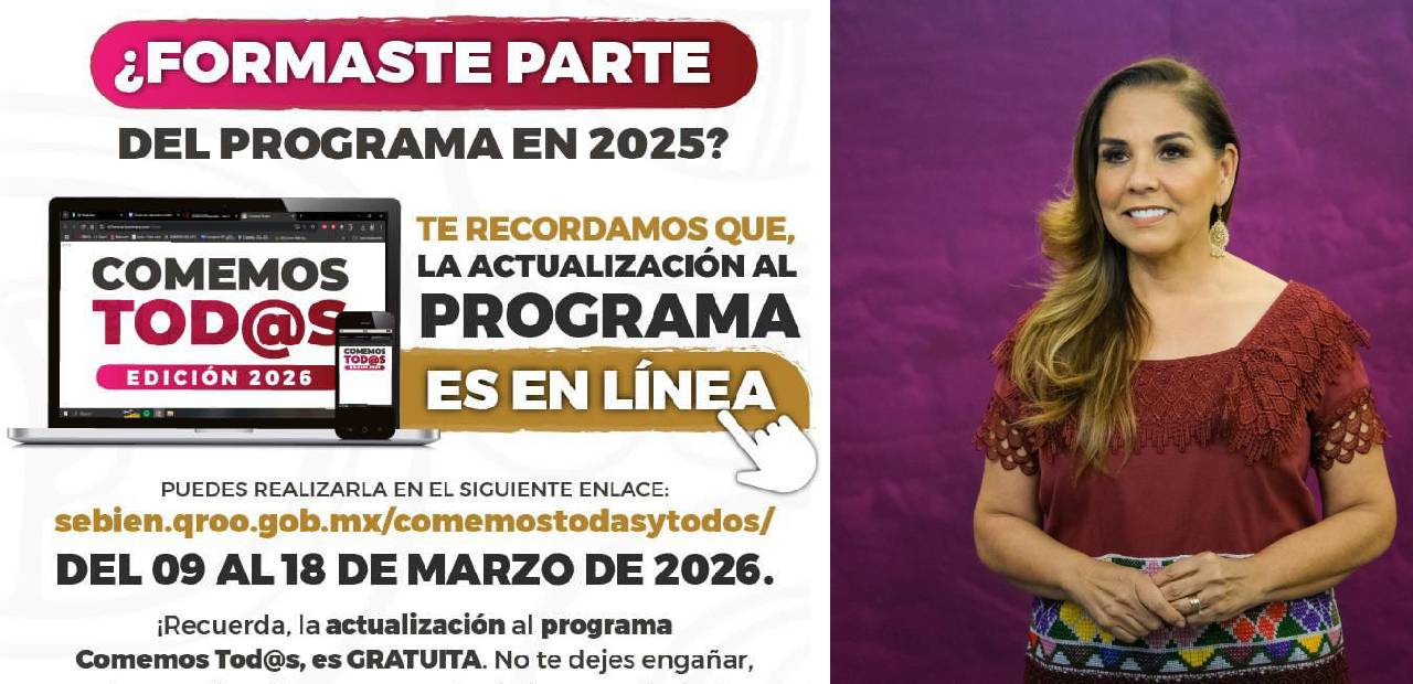 Cancún, Quintana Roo.- La gobernadora de Mara Lezama anunció la apertura del registro para el programa social “Comemos Todas y Todos 2026”, que  estará disponible de 9:00 de la mañana a 5:00 de la tarde, tanto en los módulos presenciales distribuidos en los municipios de Quintana Roo como a través del portal de la Secretaría de Bienestar estatal.