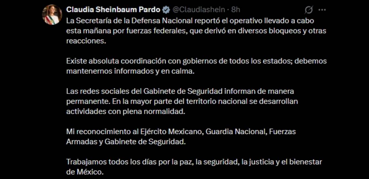 En el plano político, la presidenta Claudia Sheinbaum ha asumido una postura más frontal frente al crimen organizado, respaldando operativos militares y reforzado la coordinación con fuerzas federales y la cooperación con Estados Unidos.