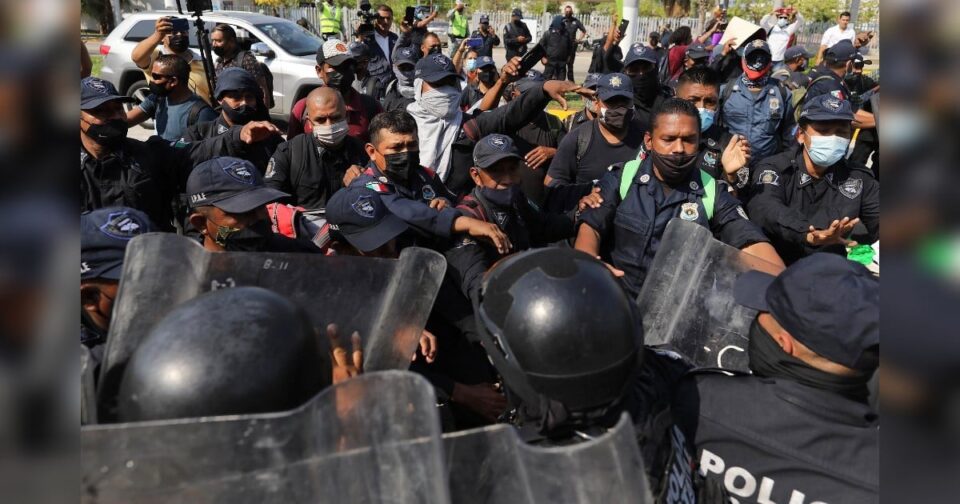 “Somos policías y no contamos con seguro digno”, “Requerimos un salario digno” y “Aumento de salario, seguridad social y vacaciones como marca la ley”, eran las principales consignas de los inconformes.