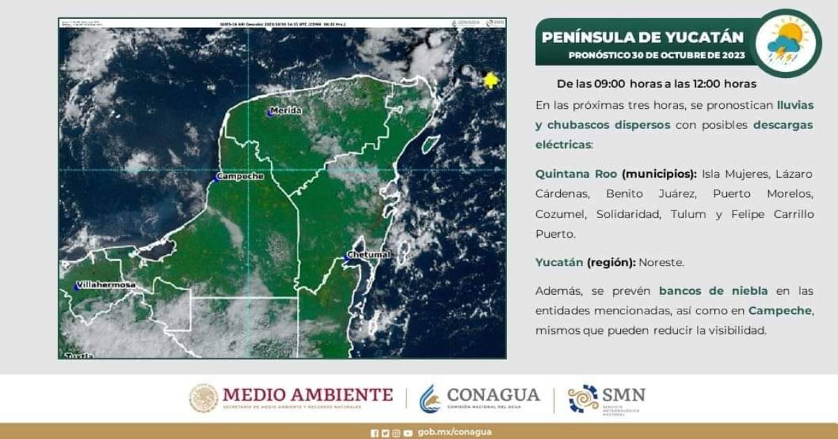 Quintana Roo.- La Conagua Comisión Nacional del Agua-SMNmx informa que para las próximas horas se pronostican lluvias y chubascos dispersos con posibles descargas eléctricas, para los municipios de Isla Mujeres, Lázaro Cárdenas, Benito Juárez, Puerto Morelos, Cozumel, Solidaridad, Tulum y Felipe Carrillo Puerto.