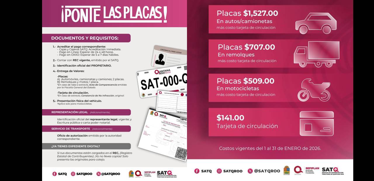 El SATQ ha habilitado múltiples módulos de atención en Cancún, Playa del Carmen y Chetumal, también hace un llamado a los ciudadanos a planear con anticipación el reemplacamiento y aprovechar las tarifas actuales antes de que suban.