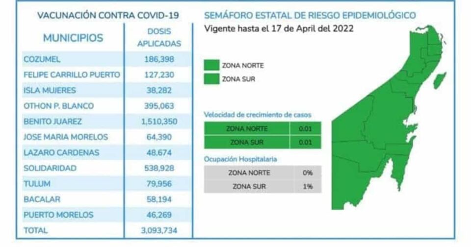 En su reporte, la Secretaría estatal de Salud, refiere que hasta el 11 de abril se confirmaron 91, 652 casos positivos de COVID-19 en Quintana Roo, recuperado 86, 963 personas, aplicadas 3 millones 93 mil 734 vacunas y reportado 4,381 defunciones.