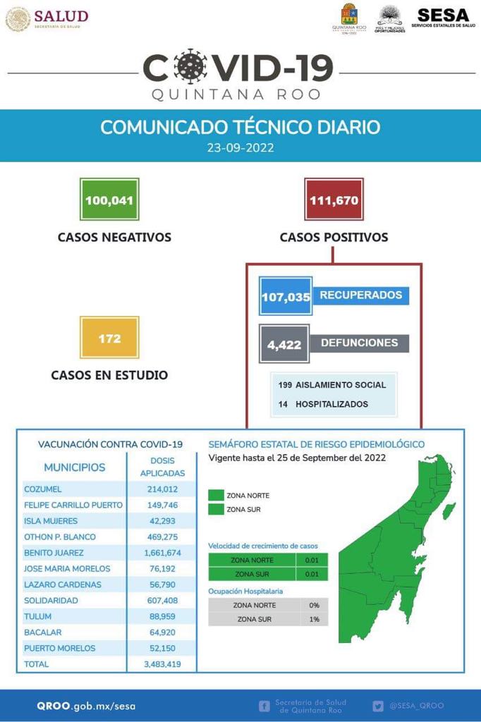 El Comunicado Técnico Diario que elabora el gobierno estatal, indica que hasta el 23 de septiembre ya se confirmaron 111,670 casos positivos de COVID-19 en Quintana Roo, se recuperaron 107,035 personas y se registran 4,422 defunciones.