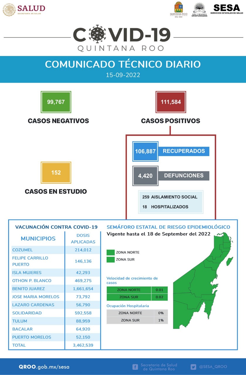 El Comunicado Técnico Diario que elabora el gobierno estatal, indica que hasta el 15 de septiembre ya se confirmaron 111,584 casos positivos de COVID-19 en Quintana Roo, se recuperaron 106,887 personas y se registran 4,420 defunciones.