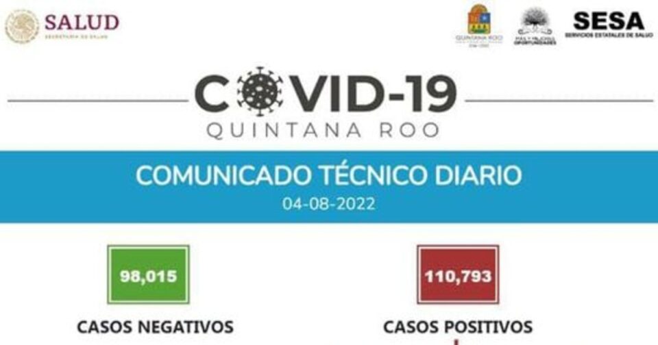 El Comunicado Técnico Diario que elabora la Secretaría estatal de Salud, indica que hasta el 4 de agosto ya se confirmaron 110, 793 casos positivos de COVID-19 en Quintana Roo, se recuperaron 104, 88 personas y se registran 4,412 defunciones.
