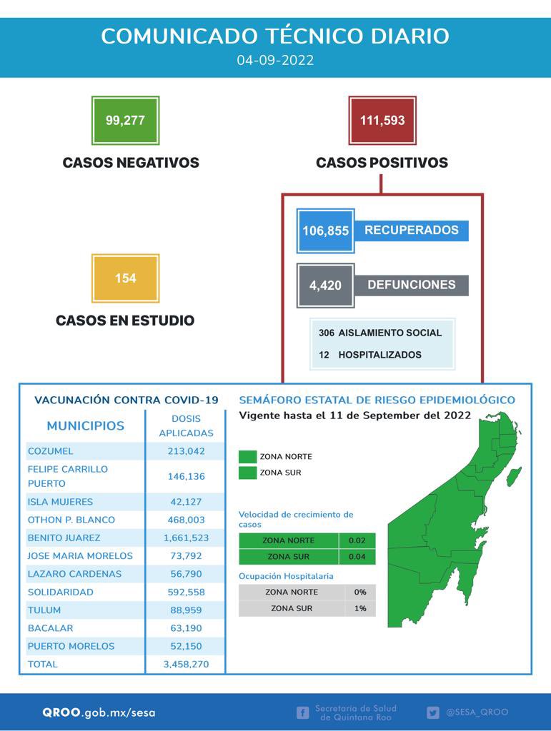 El Comunicado Técnico Diario que elabora la Secretaría estatal de Salud, indica que hasta el 4 de septiembre ya se confirmaron 111, 593 casos positivos de COVID-19 en Quintana Roo, se recuperaron 106, 855 personas y se registran 4,420 defunciones.