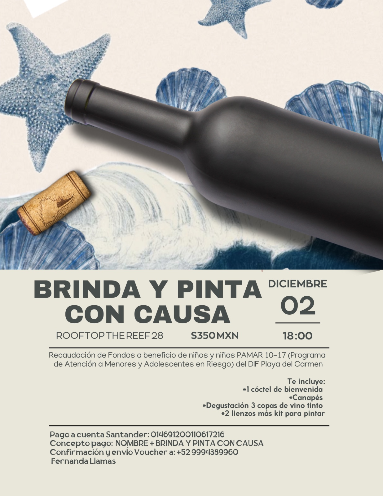 Playa del Carmen.— Con el objetivo de apoyar a niñas, niños y adolescentes del programa PAMAR 10–17 del DIF Solidaridad, este 2 de diciembre se llevará a cabo el evento “Brinda y Pinta con Causa”, una iniciativa que combina arte, convivencia y recaudación de fondos en un ambiente relajado frente al mar.