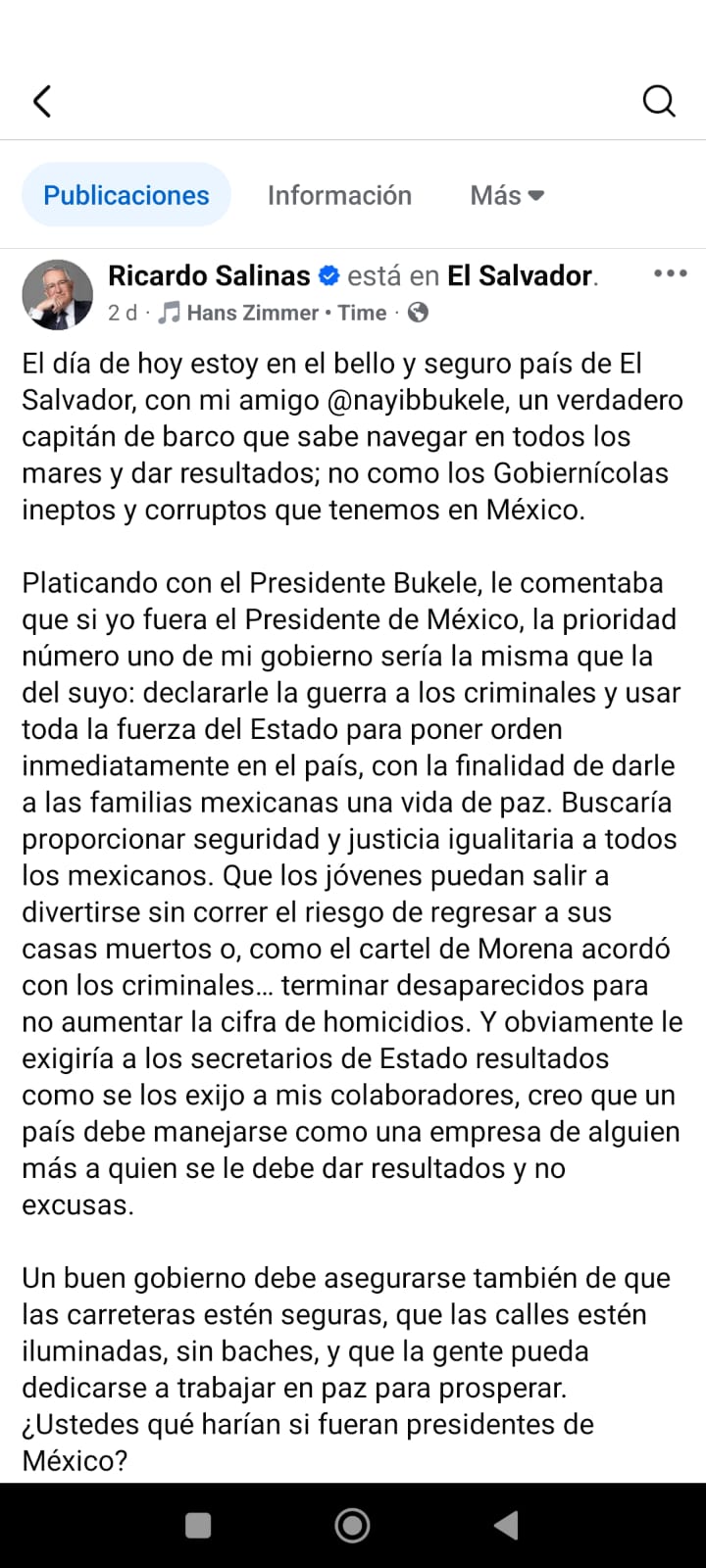 A través de una publicación en su cuenta de X, Salinas Pliego describió a Bukele como “un verdadero capitán de barco que sabe navegar en todos los mares y dar resultados”, y contrastó esa imagen con lo que, según él, ocurre en México. Según sus declaraciones, calificó al gobierno mexicano como integrado por “Gobiernícolas ineptos y corruptos”.