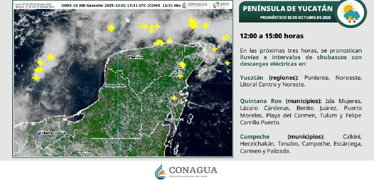 Cancun.- La Comisión Nacional del Agua (Conagua) en su reporte meteorológico para este jueves 2 de octubre prevé condiciones meteorológicas inestables para Cancún.
