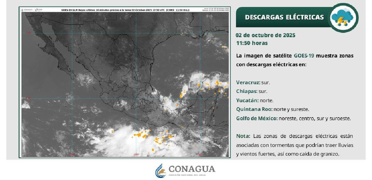 El reporte señala que, debido a la presencia de un canal de baja presión en el Golfo de México y la entrada de humedad del mar Caribe, se espera cielo medio nublado a nublado con intervalos de chubascos y lluvias puntuales fuertes, acompañadas de actividad eléctrica.