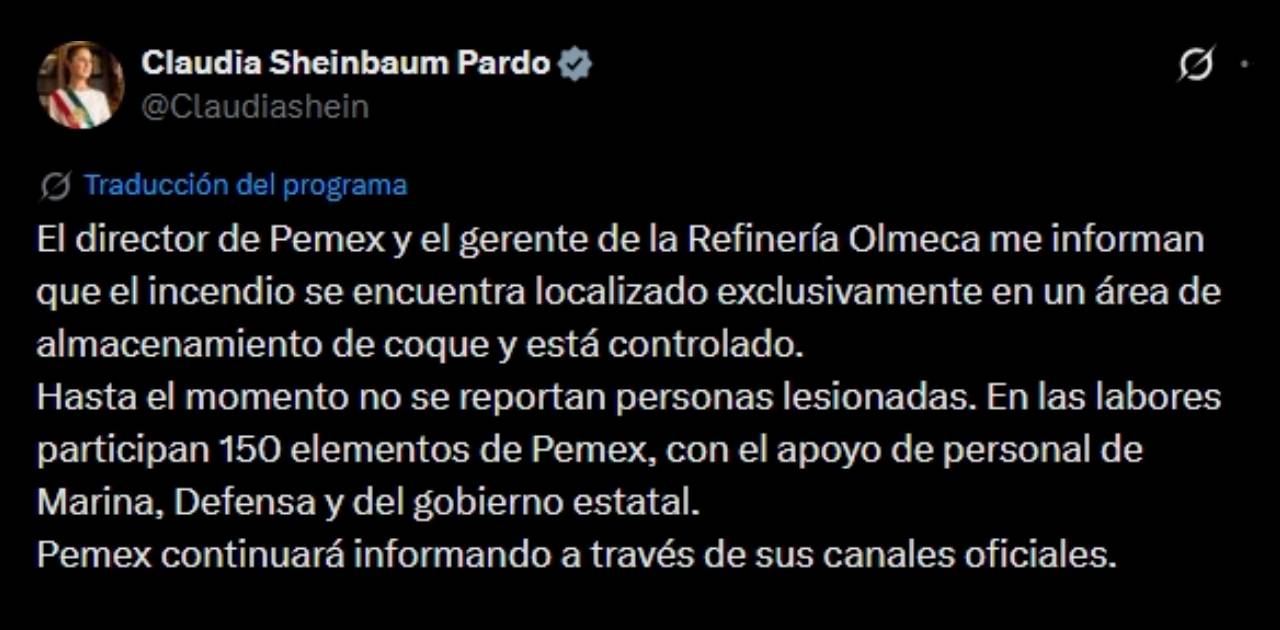 Sheinbaum aclaró que el siniestro fue atendido de manera oportuna por los equipos de emergencia, lo que permitió contenerlo rápidamente. Además reiteró que se mantienen en marcha las investigaciones correspondientes para determinar las causas del incendio, en coordinación con autoridades como Pemex y la Fiscalía.
