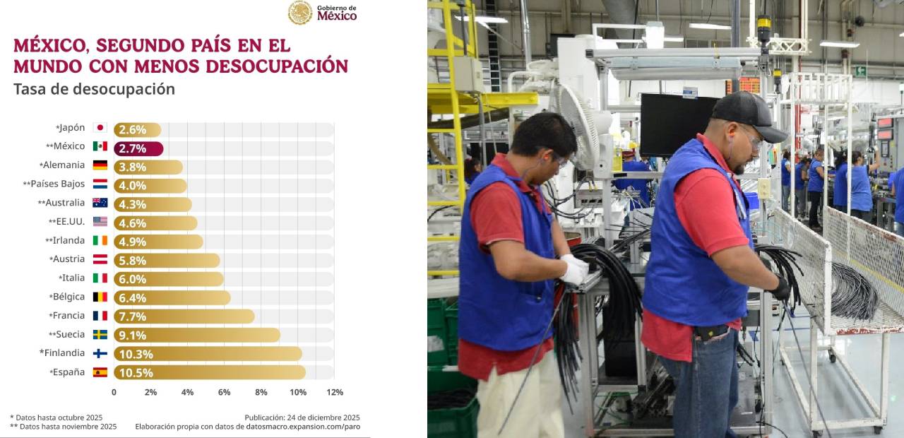 Ciudad de México.- En la más reciente evaluación del entorno laboral y económico nacional, la presidenta Claudia Sheinbaum resaltó que la tasa de desempleo en México se ubicó en 2.7% de la población económicamente activa hasta noviembre, una cifra que coloca al país por debajo de muchas economías desarrolladas, solo superado por Japón entre los países comparados.