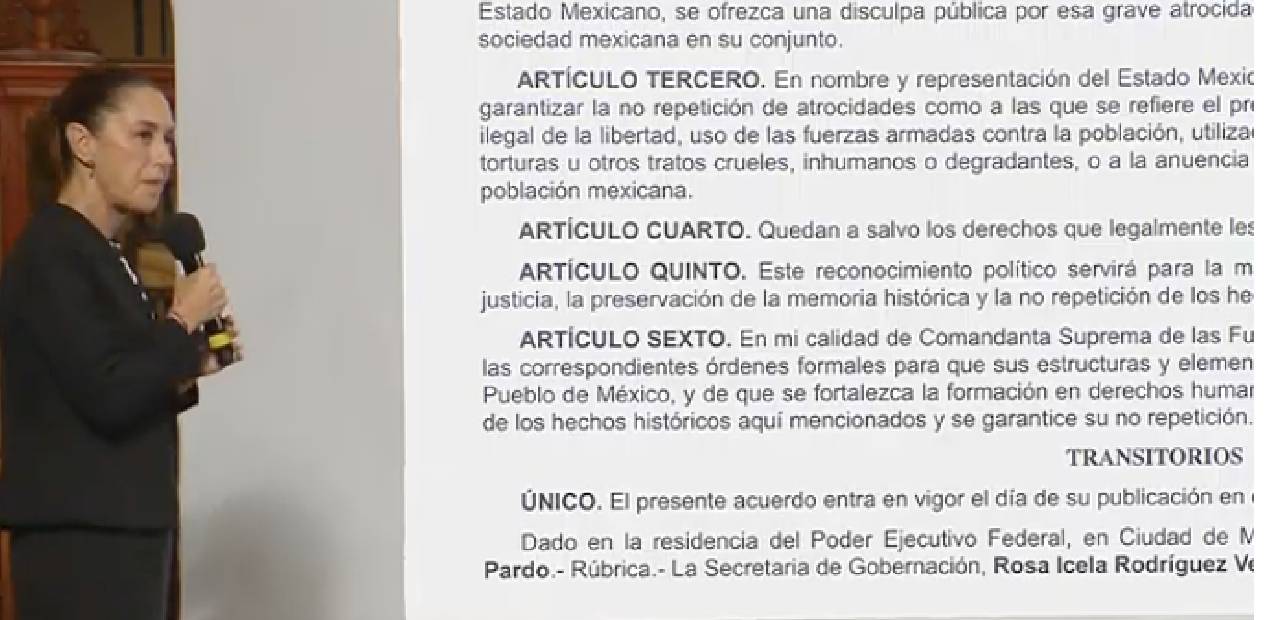 Ciudad de México.- En conmemoración del 2 de octubre en la Conferencia de Pueblo, la Presidenta de México, Claudia Sheinbaum leyó el acuerdo donde el Estado Mexicano reconoce oficialmente la matanza estudiantil de 1968 en Tlatelolco, se declaró como un crimen de lesa humanidad.