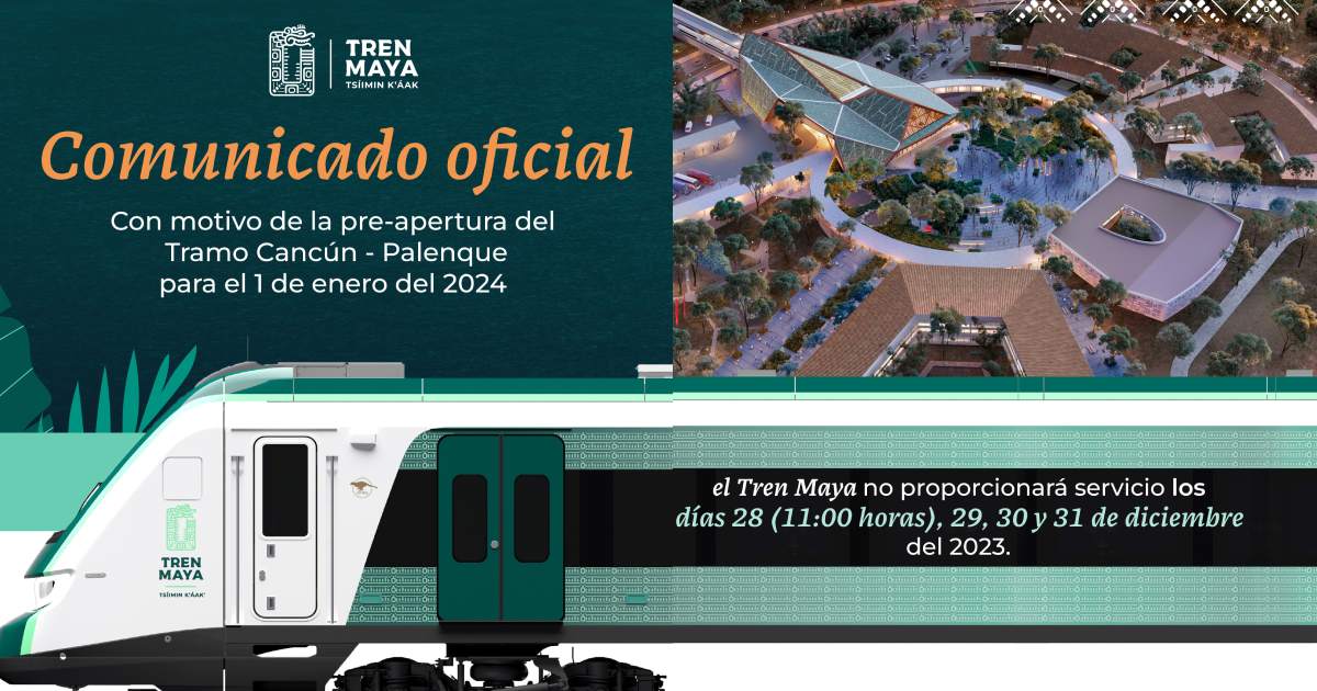 Mediante X, antes Twitter, el Tren Maya informó que por motivo de la preapertura de la nueva ruta Cancún-Palenque para el 1 de enero de 2024 detendrá operaciones los últimos 4 días del año, a partir de las 11 horas del 28 de diciembre.